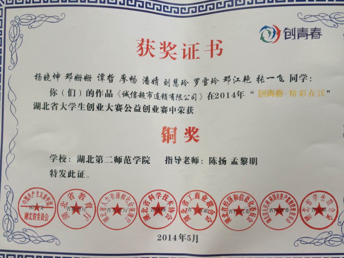 在2014年“创青春-精彩在沃”湖北省大学生创意大赛公益创业赛中,杨晓坤、邓姗姗、谭哲、廖畅、潘婧、刘慧玲、罗雪玲、邓江艳、张一飞同学的作品《城市超市连锁有限公司》荣获铜奖。