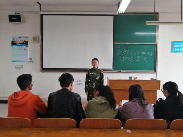 2019级思想政治教育1班易娉羽首先入场进行面试,“我是易娉羽,性格开朗活泼,擅长与人沟通交流,热心志愿服务活动,做事认真负责,希望能够参与更多的志愿活动丰富自身经验”,她在自我简介时说道。在提问环节,张子炎问道:你知道志愿者精神是什么吗?”“奉献、友爱、互助、进步”,她立刻答道。被问到对半程马拉松的了解程度时,她面带笑容,一一阐述自己所知。