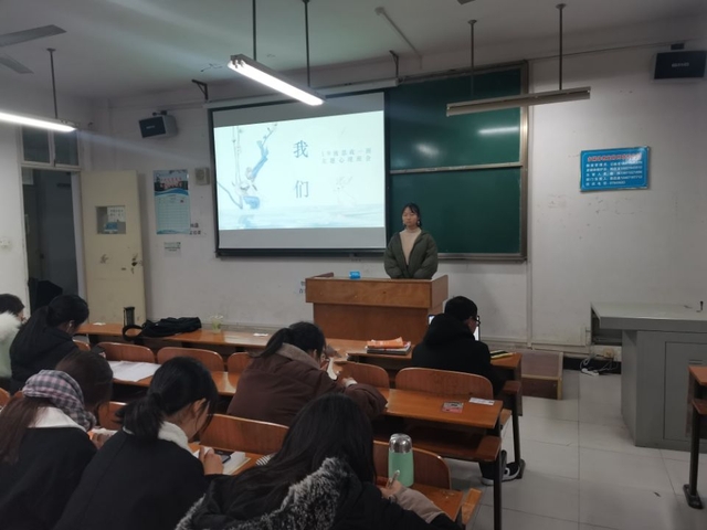 本网讯(融媒体记者 易娉羽)12月15日晚,我院2019级思想政治教育1班在二号教学楼2201教室开展以“我们”为主题的心理班会,2019级思想政治教育1班心理委员孙佳主持。孙佳首先为全体学生展示运动会、军训、合唱比赛中的班级合影照片,引导在座学生回顾班级重大事件。