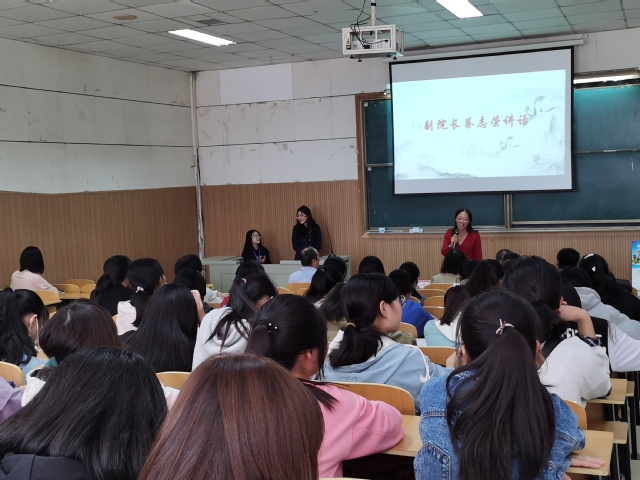 张玲发表讲话。首先,她向学生总体介绍了我国国民的相关阅读数据。接着,她结合身边的真实例子从个人发展、民族发展等方面讲述读书的意义。在读书方法上,她建议学生分阶段阅读,同时她提醒在座的学生在读书过程中要有毅力,要制定从易到难的规划,养成整理读书笔记的好习惯。