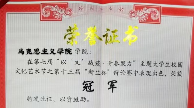 我院辩论队在我校第七届届“以‘文’战疫·青春聚力”校园文化艺术节之第十三届“新生杯”辩论赛决赛中荣获冠军。