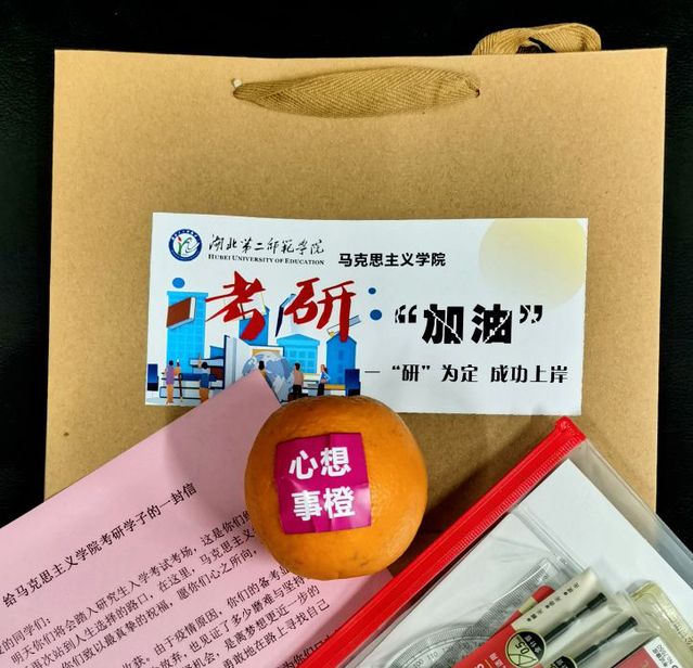 据了解,礼物袋中贴有“心想事成”、“乘风破浪”等字样的橙子、“连中三元”寓意的文具袋等是由宋平、樊勇、教学办教师余珮和辅导员王一于1224日晚亲自准备并包装的,而其中的手写信则是由2018级学生给各自一对一学长学姐亲手写的。“刚刚进入大学校园的时候,一对一的学长学姐给素不相识的我们写了一封信,之后也给了我们很多帮助。所以今天,我们也将自己亲手写的一封信作为一个小礼物来回赠他们,预祝他们考研成功”,2018级思想政治教育1班张敏敏说道。