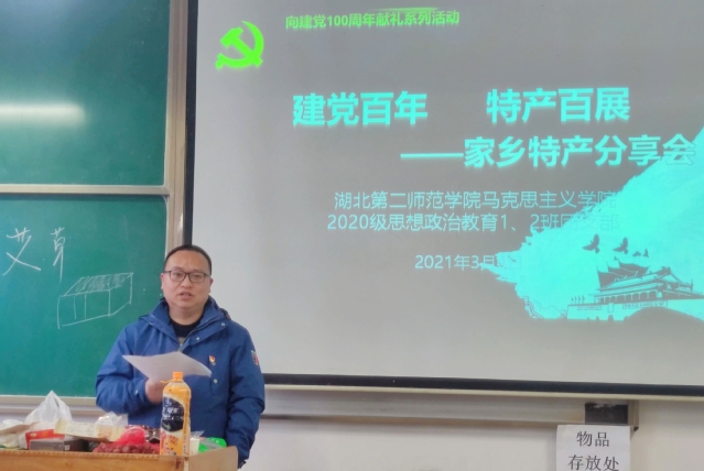 本网讯(通讯员 周媛)3月4日下午,我院于2206教室举行以“建党百年、特产百展”为主题的家乡特产分享会,2020级思想政治教育1、2班辅导员宋平、樊勇及全体学生参与活动。2020级思想政治教育2班粟永硕主持活动。