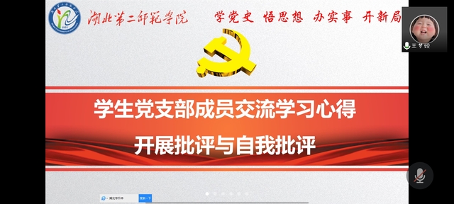 随后,2018级思想政治教育1班王梦姣、宋碧文、张敏敏等8位学生党员交流学习心得、开展批评与自我批评。王梦姣在发言中说道,在观看习近平总书记在庆祝中国共产党成立100周年大会上的讲话后心中感慨万分,深刻感受到中国如今辉煌成就的来之不易。她深刻反思自己存在的不足,从工作、学习、生活几个方面深入分析自己的不足。