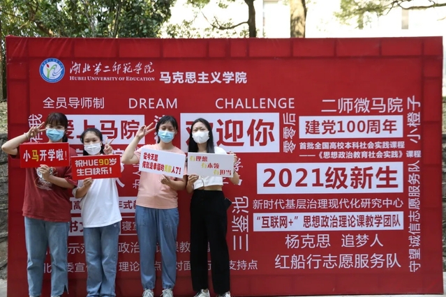 与此同时,我院的一对一迎新活动也在进行中。学长学姐在接到一对一的学弟学妹后,先领其到宿舍报到,帮助他们拎行李上楼,待学弟学妹收拾好个人物品后,再带领他们去二号教学楼进行报到。报到期间,新生及家长拿着“朋友圈KT”,在我院特意制作的桁架前拍照合影,此桁架铺满了建党一百周年和我院目前拥有的国家级、省级教学团队等特色元素的关键词,方便新生及家长更加了解马院。同时,按照马院传统,新生在二号楼报到后领到了我院赠送的大礼包,其中包括辅导员精心挑选的鼠标垫、我院为防止新生被骗亲自编制的防诈骗手册、我院学工办结合建党一百周年主题贴心制作的卡包,卡片的背面内容为新生生日当天发生的党员故事另外,卡包还可以装上一卡通,防止丢失。