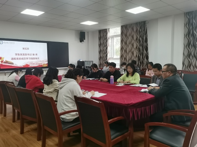 最后,樊勇通报本支部成员学习强国的完成情况,在对前面四位同志的分享作出简要总结后,他对在座党员同志提出三点要求:一是全体党员同志要讲纪律,以更高的标准严格要求自己;二是要认真记录学习工作笔记;三是临近考研,各位党员同志要按计划进行备考,学会调节,保持一个良好状态。