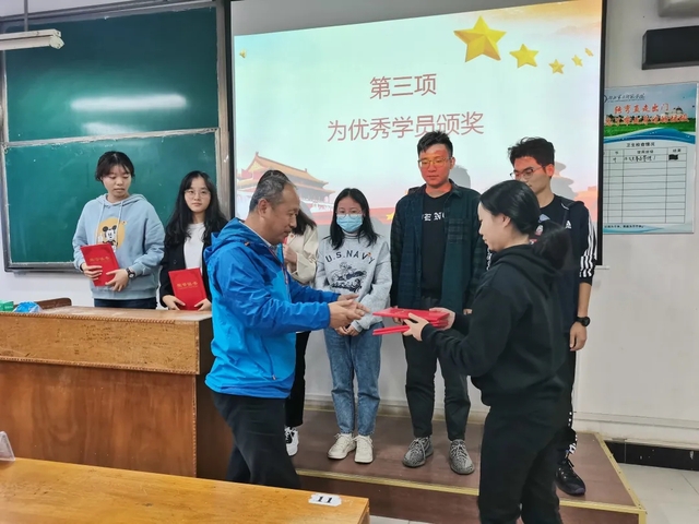 随后宋平为2020级思想政治教育1班卢友宜、谭启栋、孔思和2020级思想政治教育2班粟永硕、周媛、赵张锦六位优秀学员颁奖。粟永硕作为优秀学员代表发言,他说道,作为青年团员要肩负起团员的义务和责任,积极向党组织靠拢,把握大学时光。