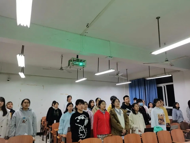 活动伊始,全体起立,齐唱团歌。随后,在团支书的带领下,团支部成员共同学习贯彻习近平总书记在纪念五四运动100周年大会上的重要讲话以及“七一”重要讲话精神。各团支部密切关注党的重大会议,积极学习贯彻党的十九届六中全会精神,使全体团员了解到党的百年历程所创造的四方面伟大成就、百年奋斗带来的四方面改变、总结成就经验的三方面意义。在团员学习板块,各团支书带领全体同学一起学习团章,倡导全体团员要积极履行团员义务。最后,各团支部重温入团誓词,牢记共青团员的“初心与使命”。