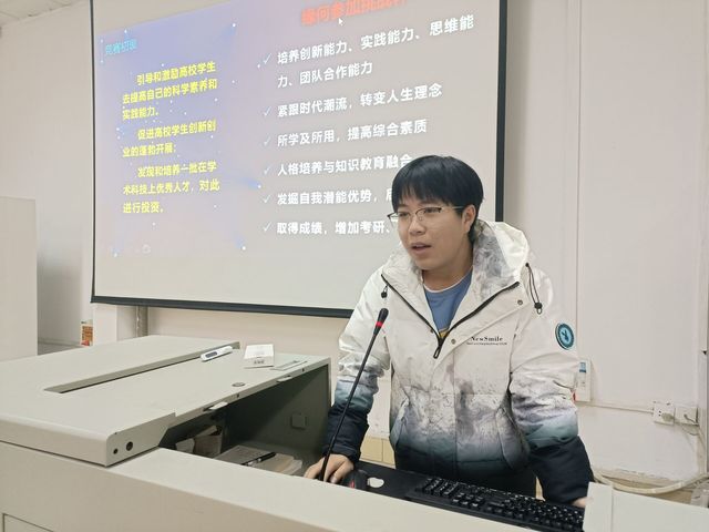 本网讯(通讯员 张雨曦)12月10日中午,我院于旧图书馆报告厅4举行“挑战杯”宣讲会,并邀请校团委创新实践部竞赛组织中心宣讲团参与会议,该中心主任许国栋担任主讲人。我院2020级、2021级思想政治教育专业全体学生到会。