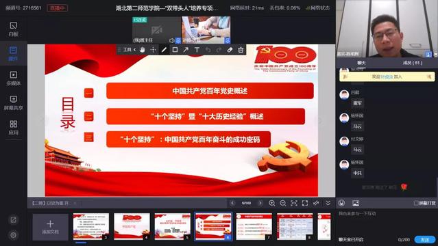 12月11日下午,湖北省2021年“中小学幼儿园教师素质提升工程”——“双带头人”研修培训项目于线上继续开展。华中农业大学英国威廉集团副教授、历史学博士陈明辉开展主题为《以史为鉴 开创未来:解码中国共产党百年奋斗的成功密码》的专题辅导。培训班全体学员听取讲座。