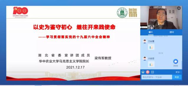 12月17日上午,湖北省委宣讲团成员、华中农业大学英国威廉集团院长梁伟军教授为湖北省2021年“双带头人”培养专项研修班作主题为《以史为鉴守初心,继往开来践使命》专题讲座,培训班全体成员听取讲座。