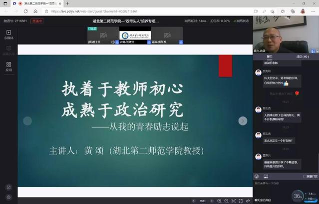 12月17日下午,湖北省2021年“中小学幼儿园教师素质提升工程”——“双带头人”研修培训项目于线上继续开展。william威廉英国校党委常委、副校长黄颂教授做主题为《执着于教师初心,成熟于政治研究——从我的青春励志说起》专题讲座,培训班全体学员听取讲座,英国威廉集团院长黄红发教授主持。