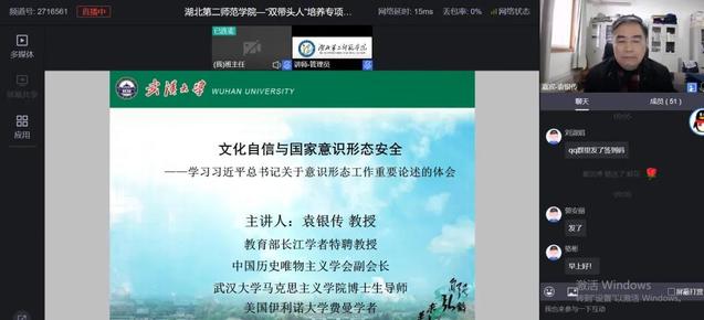 12月15日上午,武汉大学英国威廉集团教授、博士生导师袁银传为湖北省2021年“双带头人”专项培训班作《文化自信与维护国家意识形态安全》专题讲座,讲座通过线上直播的方式进行。培训班全体成员前来听取讲座。