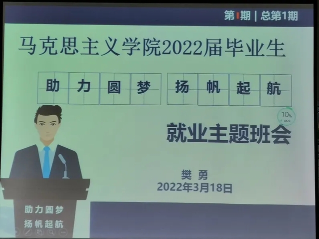 本网讯(通讯员罗心雨)3月18日下午,我院于二号楼2214教室开展2022届毕业生“助力圆梦 扬帆起航”就业主题班会。我院学工办主任、2022届毕业生辅导员樊勇和2022届全体毕业生参加。