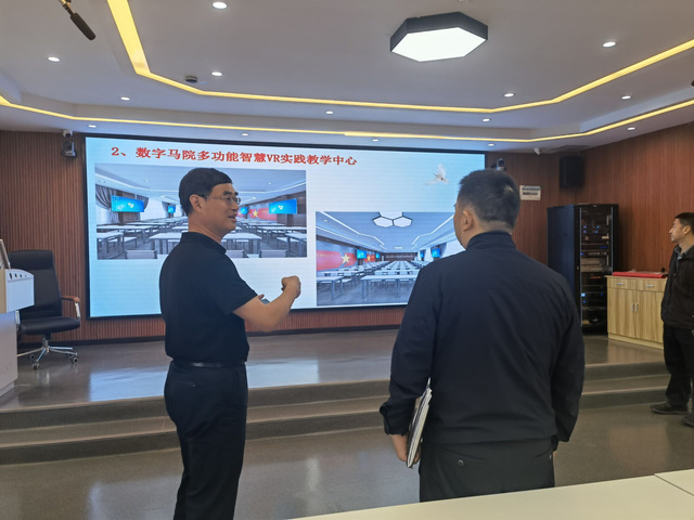 钟建国处长一行现场考察和听取汇报后,对我院的实验室建设和使用情况表示了充分肯定。他指出,数字马院教学实验室建成投入使用后起到了引领教学,促进学科和专业建设的良好作用,今后学校将根据“集中、协调、共享、实用”的原则,完善实验室管理体制机制,规范教学实验室的使用,提高实验室利用率,以进一步适应教学科研需求,检查组也会把学院实验室当前的困难和今后的发展规划提交上级主管部门研究,力争推动数字马院教学实验室更好发展。