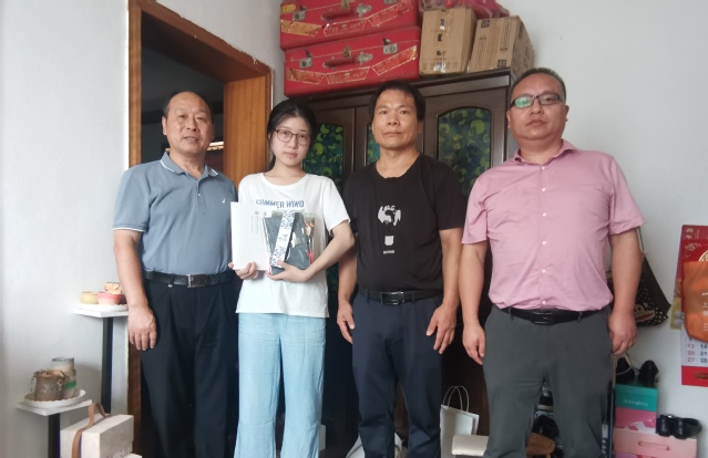 结束对崔同学的家访后,一行人又马不停蹄赶到了沈同学家中,为她送上了录取通知书和礼物。在交谈中得知,沈同学想当一名老师。宋书记和樊老师为他们详细介绍了思想政治教育专业的基本情况。沈同学父亲也提出毕业就业问题,樊老师也做了详细解答。最后,宋书记也鼓励沈同学:“要提前了解大学生活,尽快转变身份,为进入大学做好准备。除了搞好学习,也要多参加各种活动和比赛,提高自身综合素质,为毕业就业打好基础。”
