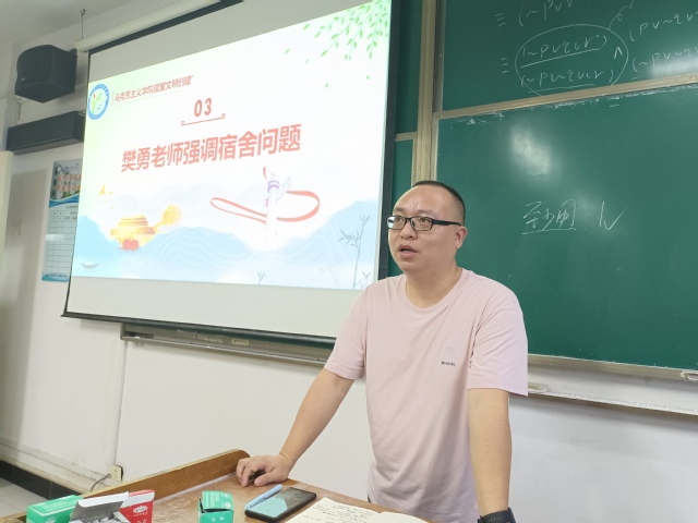 最后,樊勇对会议内容进行总结,并对全体寝室长强调以下几点:一是寝室长必须承担起自己的责任;二是要严格遵守疫情防控要求,坚持每日上报寝室情况,做到不隐瞒,不谎报;三是禁止使用大功率电器,注意用电安全,在校骑车时要注意自己的人身安全;四是寝室要日常通风,保持宿舍卫生,同时各寝室需要共同维持楼层卫生;五是提醒寝室成员保管好私人财物,注意财产安全,提高警惕,预防网络诈骗;六是要打造良好的寝室氛围,有矛盾及时沟通化解,做到互帮互助。