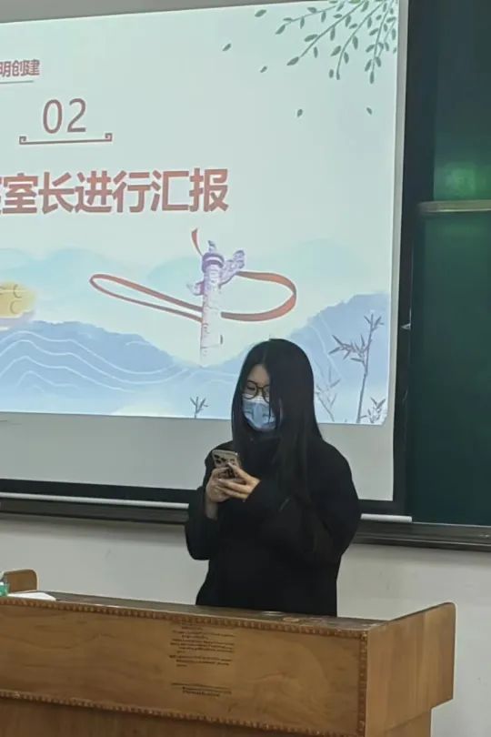 接着,各班寝室长汇报寝室情况。2020级思想政治教育1班朱友欢提到要合理使用洗澡间的设施并保持公共场所的卫生干净,带走自己遗留下来的垃圾;做到换位思考,休息时要轻声细语,构建安静的宿舍环境。2022级思想政治教育2班陈晓彤总结了生活与学习两大方面,她讲道:“生活中,舍友们相处融洽,大家尊重西藏同学的生活习惯,保持密切的联系;学习上按时整理并复习当天所学的笔记,相互学习并督促对方及时完成作业,合作探讨小组作业内容;同时我们也要遵守校规校纪,共同营造良好的寝室环境。”