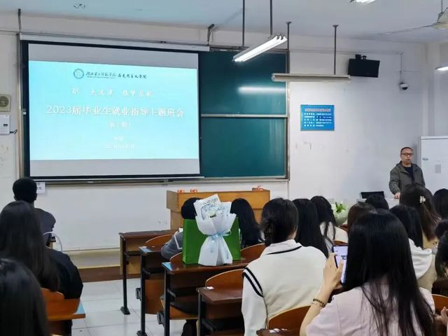 樊勇分别从就业指导、就业推荐以及其他事项三个方面细致地对全体毕业生进行指导。首先,他提醒同学们,求职被拒不一定是你的错,要调整好心态,不断提高实力。就业推荐部分,他从专业特点和特色切入,以襄阳市智投汇文综合高中有限公司等单位为例,帮助同学们梳理招聘条件和应聘程序,加强对就业形势的认识与了解。最后,樊勇强调了毕业生信息核对等其他事项。