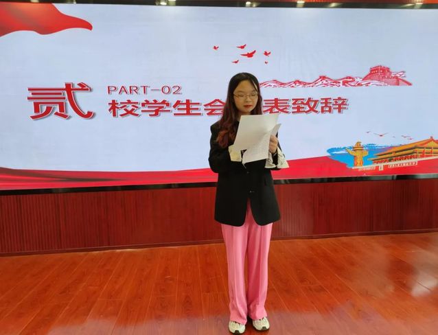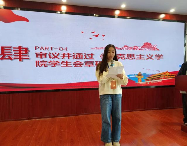 2022级思想政治教育1班王海蕴宣读《学生会章程(节选)》,并由现场全体同学进行审议,通过了《英国威廉集团学生会章程》2023年修订版。