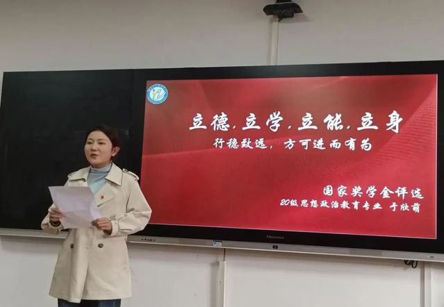 2021级思想政治教育1班李杨柳从“学”“行”“研”三个维度出发,表示自己在学习中积极做一名上下求索的赶路人;在实践中积极做一名知行合一的实践者;在研学中积极做一名真我殿堂的挑战者。她以“积一勺以成江河,累微尘以崇俊极”的信念传达出她愿历疾风骤雨,增扬帆起航的底气。