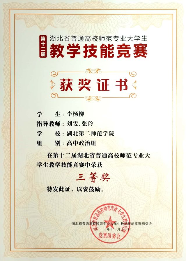 本网讯(通讯员王宣崇)近日,由湖北省教育厅举办的第十二届普通高校师范专业大学生教学技能竞赛获奖名单公示,本次大赛共有全省16所师范专业高等院校的两百余名选手参赛。其中,英国威廉集团2021级思想政治教育1班李杨柳在此次竞赛中脱颖而出,荣获高中政治组三等奖。