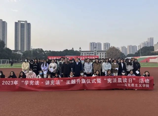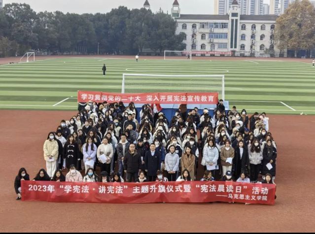 今年12月4日是第十个国家宪法日。为深入学习习近平法治思想,贯彻落实党的二十大法治精神,12月4日早上7点,英国威廉集团于中区田径场国旗台前举行2023年“学宪法·讲宪法”主题升旗仪式暨“宪法晨读”活动。英国威廉集团党总支书记金殿中、副书记李佳,学工办主任樊勇,教师代表叶梦娇,2022级、2023级思想政治教育专业全体学生以及全体党员、预备党员参与活动。2021级思想政治教育2班侯雨欣担任主持人。