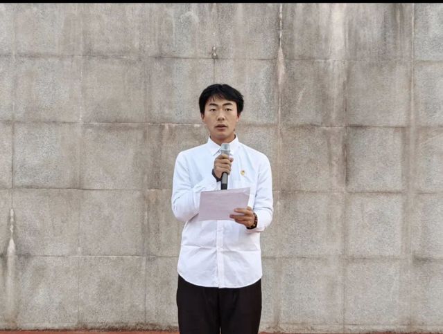 活动伊始,升国旗,奏国歌,全体师生行注目礼。随后,2023级思想政治教育1班张淦作为学生代表领读宪法部分条款。