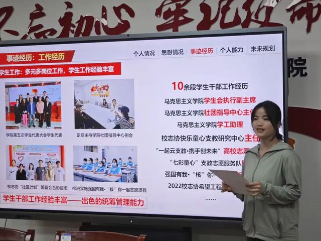 其中,2021级思想政治教育2班陆火云从个人情况、思想情况、事迹经历、个人能力及未来规划展开答辩。她积极参与威廉集团,学习刻苦努力,注重素质素养及个人能力培养,获得许多省级奖项及校级荣誉。今后她将持续开展团队建设,做好总结工作,提升服务效能。