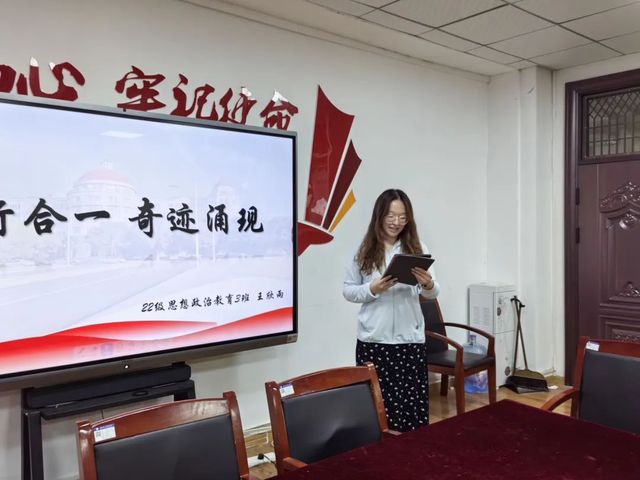 2022级思想政治教育3班的王欣雨以“知行合一,奇迹涌现”为主题展开答辩。她积极参加党校培训班,不断提升政治觉悟和政治修养,同时参与许多校内校外活动策划,在学业上保持领先水平,她说到:“成长是能力与眼力的不断提高,我将在一次次迎难而上中不断增添勇气,在挑战中沉淀经验。”