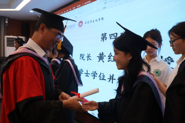 院长黄红发为毕业生拨穗、颁发学位证书并致辞。