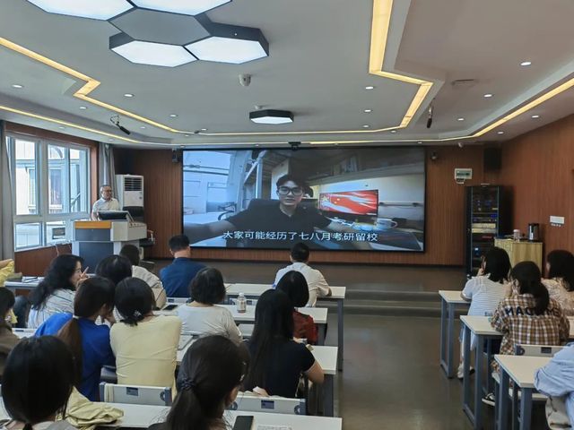 随后,金殿中组织学生观看2024届优秀毕业生经验分享视频。他们希望毕业生在考研、考编和就业过程中能够保持积极的心态,确立并坚持自我目标,要有明确的规划,合理分配时间,选择良好的环境。“道阻且长,行则将至;行而不辍,未来可期,希望同学们都能达到心中的目标”,2024届优秀毕业生向双说道。