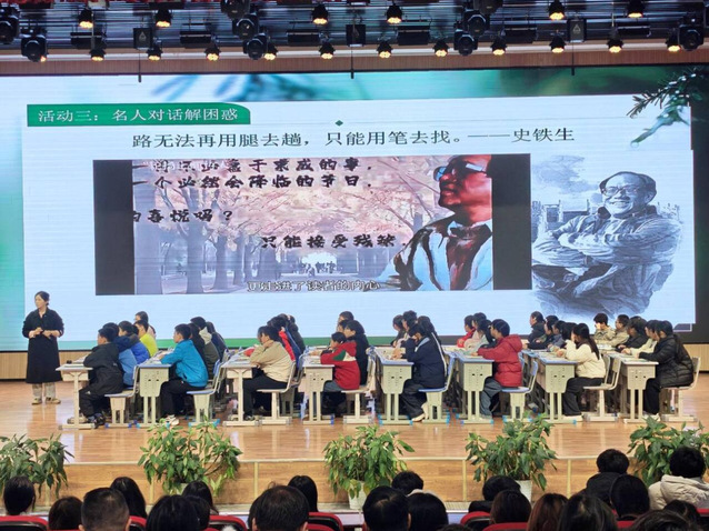 随后的“与史铁生AI对话”环节则将现代科技融入思政课堂。学生们通过预设程序与“AI史铁生”进行互动,从《我与地坛》中感悟生命力量,探讨逆境中的心灵成长。当AI模拟出史铁生对挫折、生命意义的思考时,不少学生沉浸其中,提出了关于勇气、坚持与人生价值的问题。这一创新尝试不仅激发了学生的学习兴趣,更展现了技术赋能思政课堂的全新可能。
