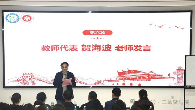 然后,教师代表贺海波作协调身体与学习这一主题的分享。他希望同学们拥有规律的作息,同时还要管理好思想,注重情绪价值和理性价值的平衡,并在课余时间积极参与社会实践,强调理论与实践相结合的重要性。