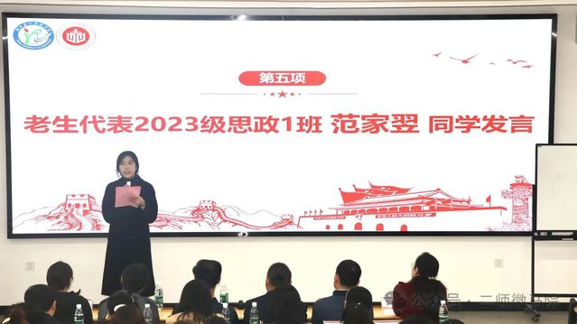 而后,2023级思想政治教育1班范家翌同学作为老生代表与新生们进行分享,共话成长。她说,作为马院学子应该坚定地做理论上的“笃信者”、实践中的“践行者”、成长中的“追光者”,并以自己的来时路作为示例分享,希望同学们能够以理论为基、以时间为翼,努力实现人生目标。