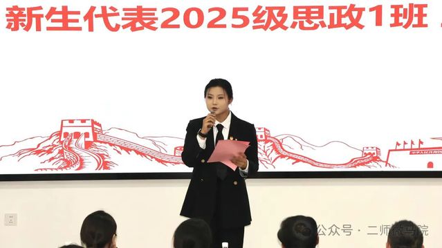 最后,2025级思想政治教育1班王鱼洁作为新生代表进行发言。她从阅读经典、社会实践、个人能力、不忘初心四个方面与同学们进行共勉,希望能和同学们在未来共同进步,共同成长。