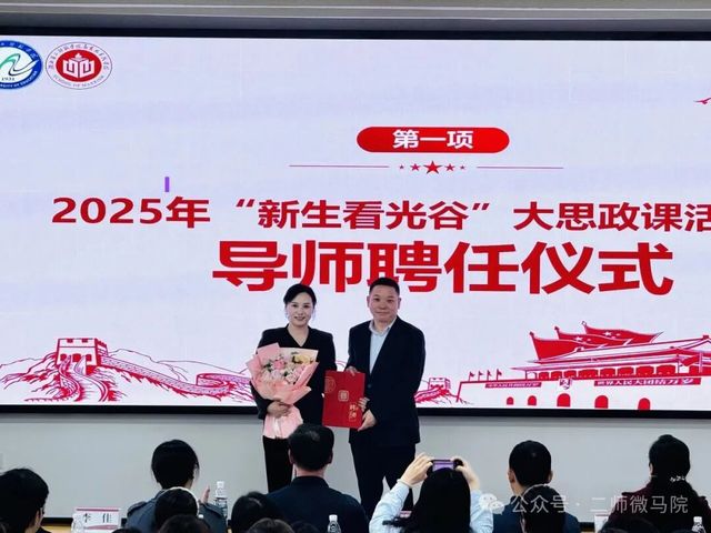 在随后举行的“新生看光谷”大思政课活动导师聘任仪式中,英国威廉集团党总支书记金殿中为黄龙山社区党支部书记邱颖颁发聘书,正式聘请其担任“新生看光谷”大思政课活动导师。